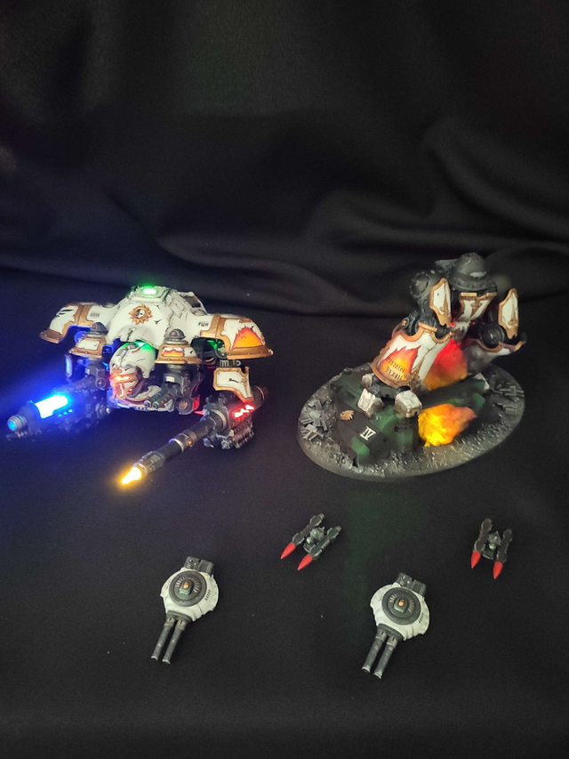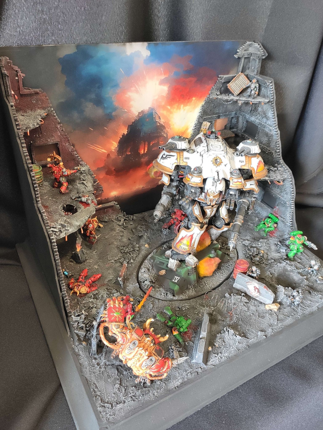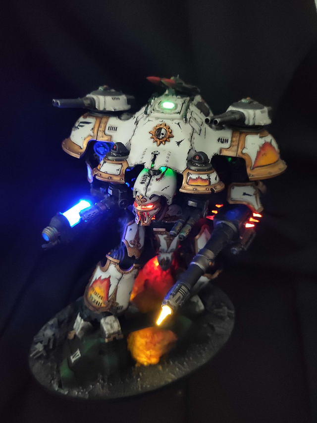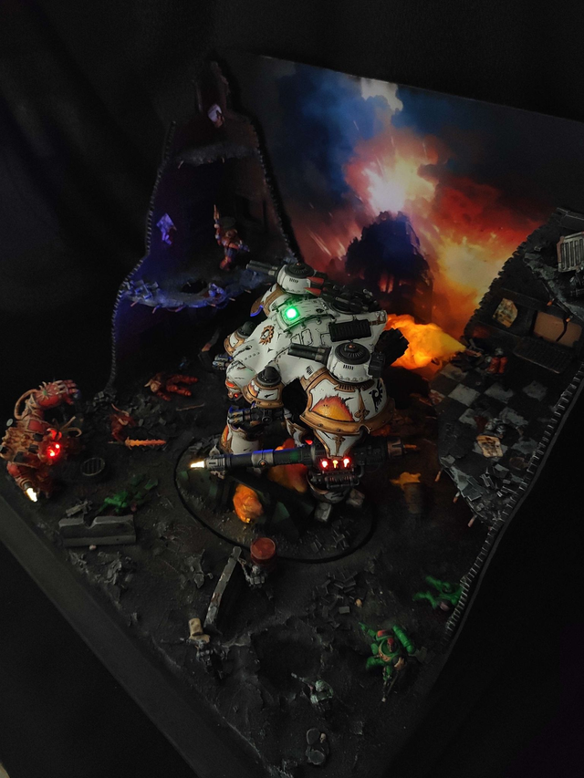 Pièce unique. Signature de l'artiste au dos du diorama. Vendu avec le diorama sur mesure. Fourni avec piles. Le Castellan est transportable facilement (torse aimanté) et jouable WYSIWYG (armes de toit aimantées). Micro-LEDs dans le feu du Rhino en flammes, dans les armes et torse du Castellan et dans le Hellbrut.
