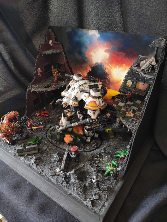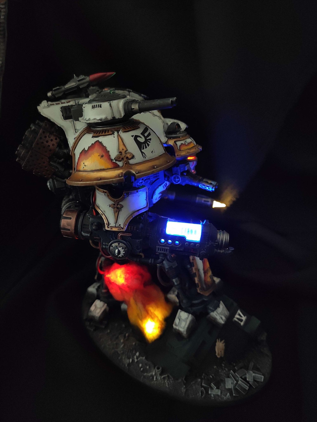 Unique piece. Artist's signature on the back of the diorama. Sold with the custom diorama. Supplied with batteries. The Castellan is easily transportable (magnetic torso) and WYSIWYG playable (magnetic roof weapons). Micro-LEDs in the burning Rhino's fire, in the Castellan's weapons and torso and in the Hellbrut.